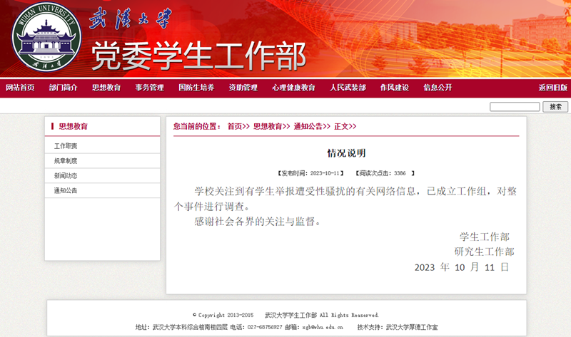 10月11日,武汉大学发布情况说明:学校关注到有学生举报遭受性骚扰的有关网络信息,已成立工作组,对整个事件进行调查。