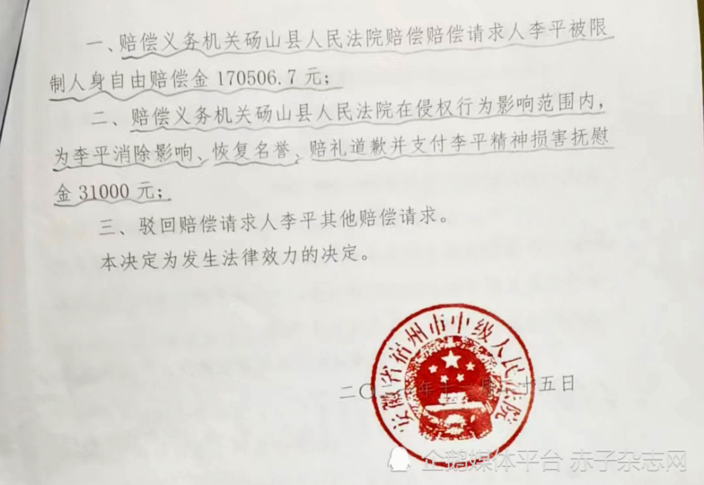 2021年11月25日,宿州中院赔偿委下达国家赔偿决定书,分别对三人进行了国家赔偿,其中李平获赔偿金170506.7元、精神损害抚慰金31000元。