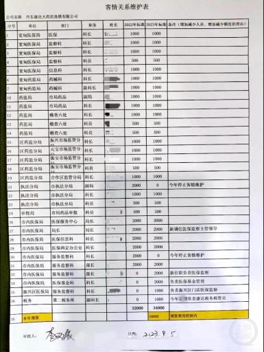 根据网络流传的这张“客情关系维护表”显示,该公司名为丹东康达大药房连锁有限公司。该表格详细列出了来自宽甸医保局、药监局、区药监分局、执法分局、市内医保局、税务等多个单位,多个科室的36名负责人的姓名、职务以及“客情维护”标准。表格显示,每人的“维护”数额从500元至2000元各不相同,2023年年度预算为34000元。
