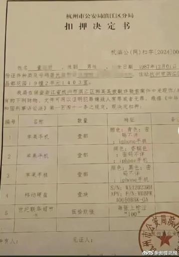 在传的杭州市公安局滨江区分局的扣押决定书显示,董某,男,生于1987年,住址在杭州市滨江区某小区。该局在侦查浙江杭州市滨江区郭某某被敲诈勒索案件中发现下列财物,文件可用以证明犯罪嫌疑人有罪或者无罪,现决定扣押3部苹果手机,1块移动硬盘,59张每张标注“100”的超市卡。