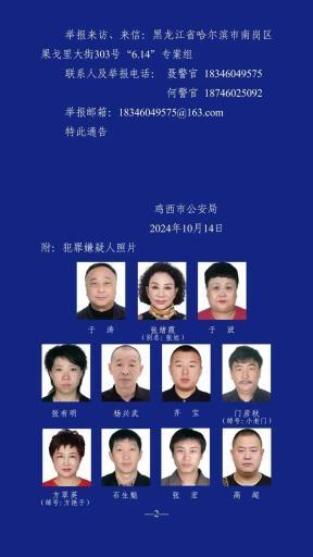 鸡西警方通告称,经黑龙江省公安厅指定,鸡西市公安局打掉了哈尔滨市以于涛、张绪霞、于波为首,张有明、杨兴武、齐宝、门彦秋、方翠英、石生魁、张宏、高超等人组成的涉嫌黑恶违法犯罪集团。