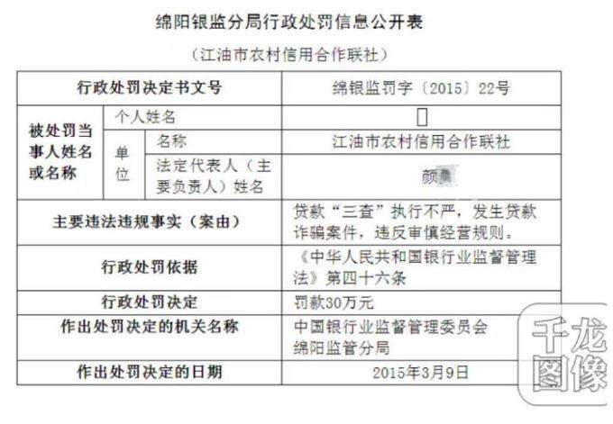 然而,华商报大风新闻记者检索发现,千龙网曾报道称,2016年6月30日,中国银监会官网发布绵银监罚字〔2015〕22号行政处罚决定书,对江油市农村信用合作联社的违规行为进行处罚,罚款人民币30万元。