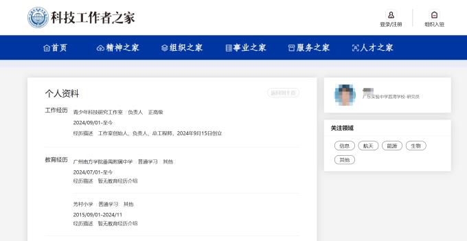根据澎湃新闻此前报道,在一个标有“中国科学技术协会版权所有”字样的“科技工作者之家”网页中,自称在广州南方学院番禺附属中学学习的中学生何某,在工作经历部分自称成为“青少年科技研究工作室正高级负责人”,并自称是该工作室“创始人、负责人、总工程师”。根据该网页资料,何某出生于2008年12月,籍贯为湖北省。