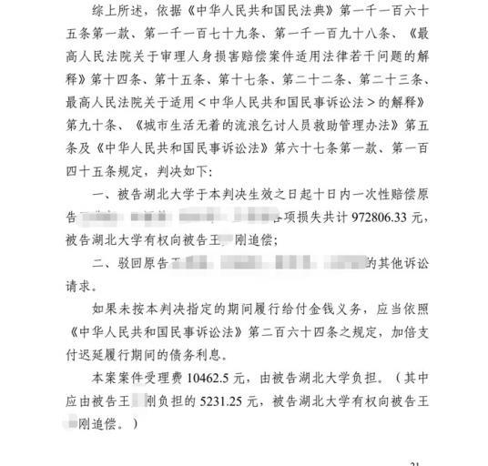 最终,法院认定原告的损失为1072806.33元,被告湖北大学对此承担全部补充责任。被告湖北大学已于2021年12月21日向原告支付的处理王某平后事的费用10万元予以扣减,需一次性赔偿原告各项损失共计972806.33元,被告湖北大学有权向被告王某刚追偿;驳回原告的其他诉讼请求。