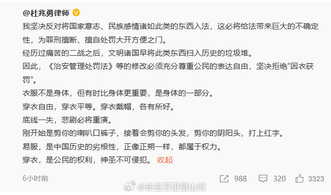 他强调,衣服不是身体,但有时比身体更重要,是身体的一部分。“穿衣自由,穿衣平等。穿衣戴帽,各有所好。”这则帖文在当天下午就被删除。