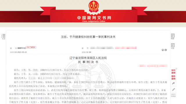 判决书显示,法院审理查明,小王因租用于某房屋而与对方相识。小王自述其分别于2022年10月14日、10月15日、10月17日与于某在未采取安措施的情况下发生性关系,后发现于某患有性疾病。现小王经中国医科大学附属盛京医院检查为“人乳头瘤病毒(HPV)阳性”,小王认为,该疾病系于某传染。