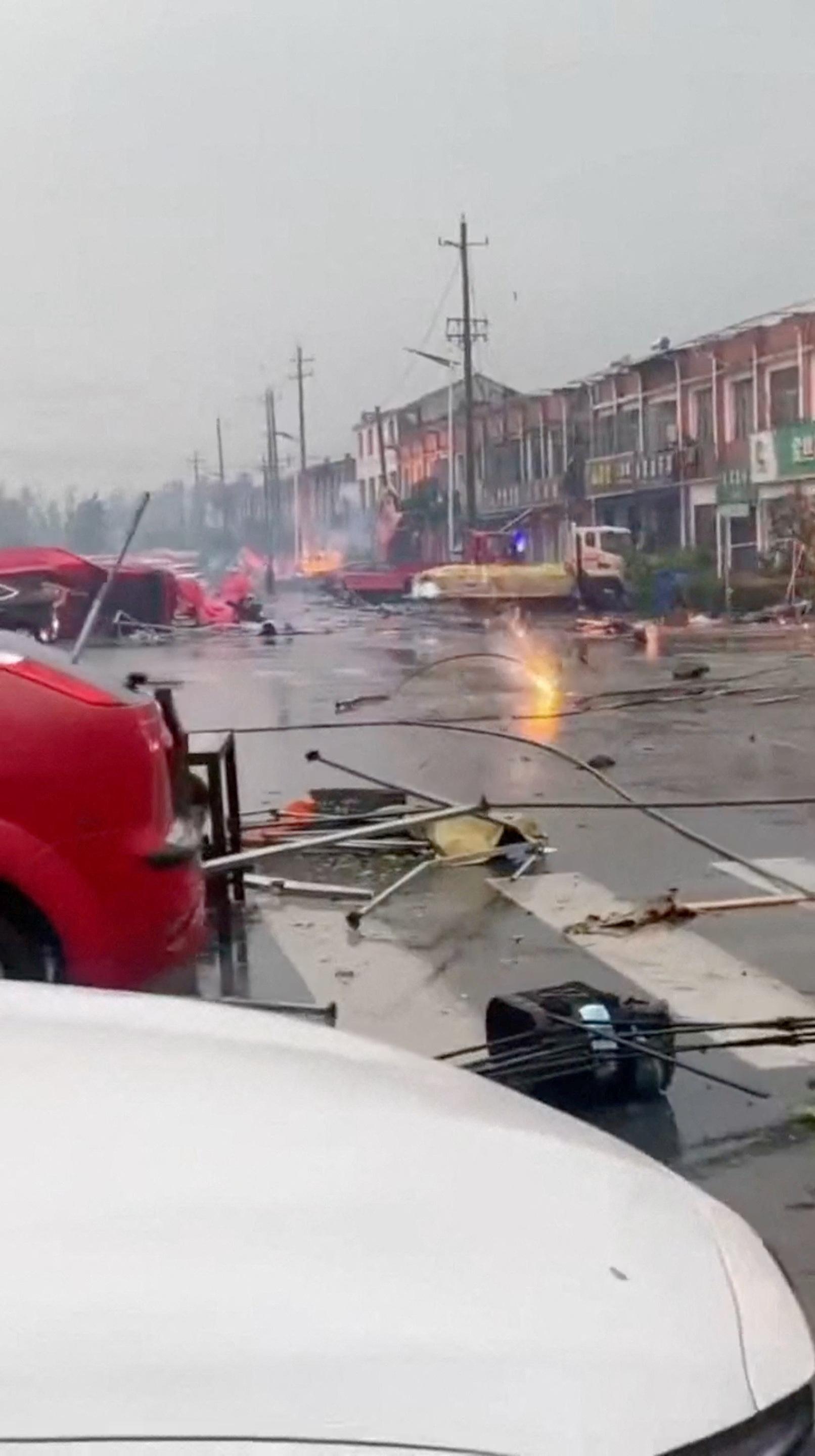 网传视频中,龙卷风过后的宿迁市街头,大量车辆和建筑物受损。(路透社)