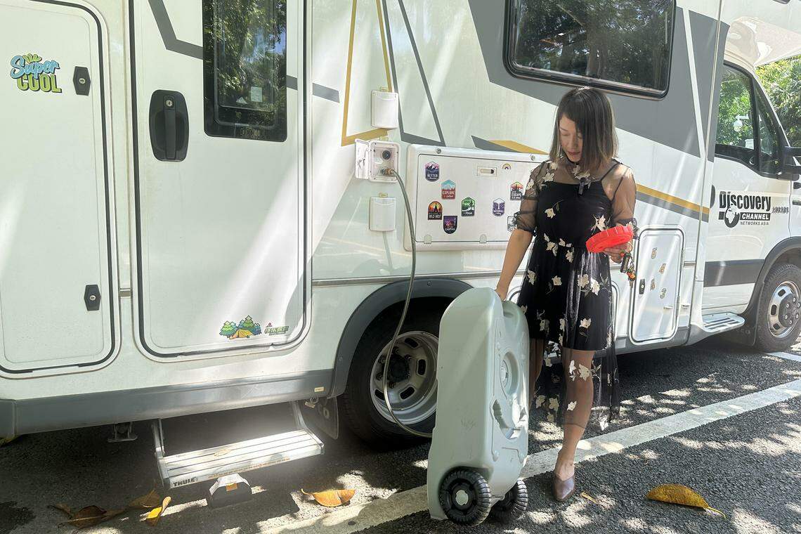 至于水源供应,沈兰的房车可储存220毫升的自来水,约每五天需要添一次。她一般会从公园的出水口直接灌水,或者使用一个40毫升的水箱,从水龙头取水,再将水抽进车内。
