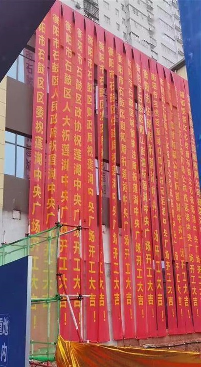 中国湖南衡阳一个楼盘现场在开工当天挂出十余个政府部门祝贺条幅,网民质问这是否涉嫌虚假宣传。