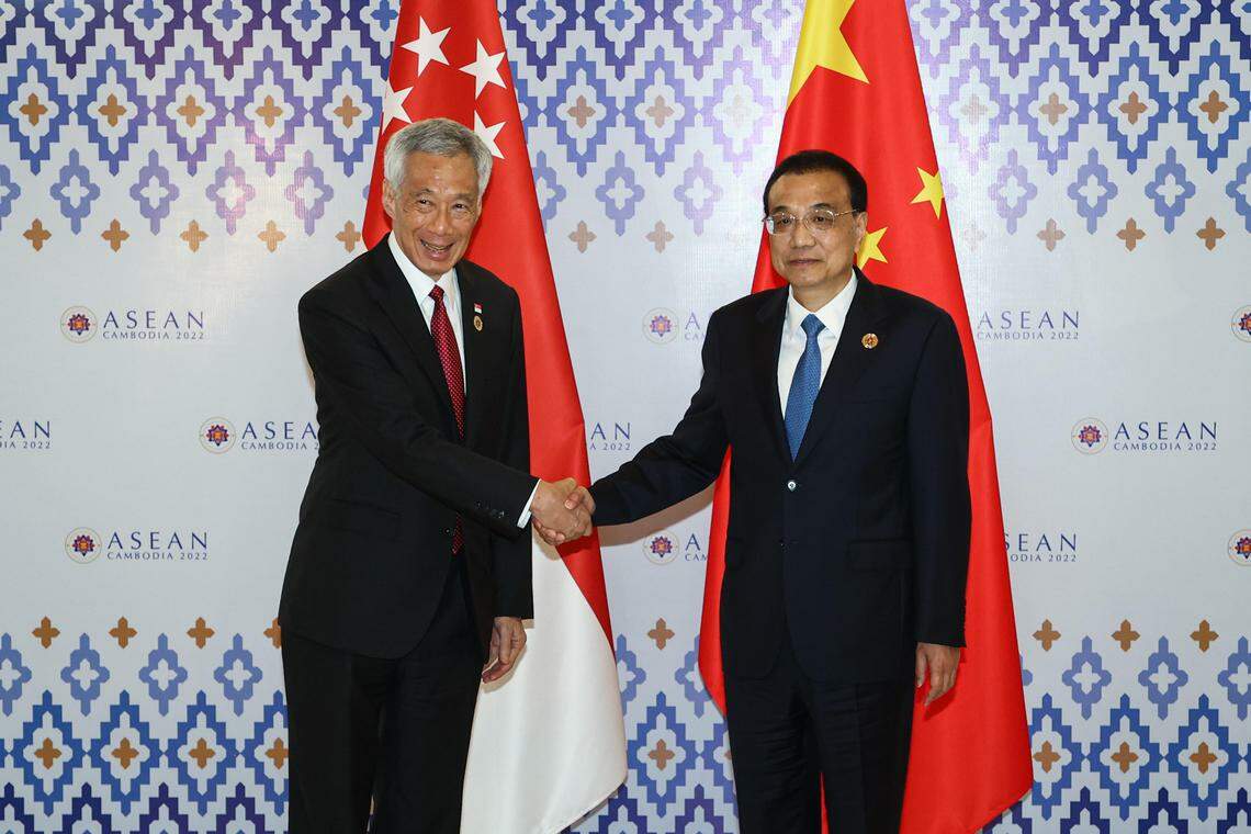2022年11月11日,新加坡总理李显龙(左)和中国总理李克强在柬埔寨金边举行的亚细安—中国峰会上聚首。(档案照片)