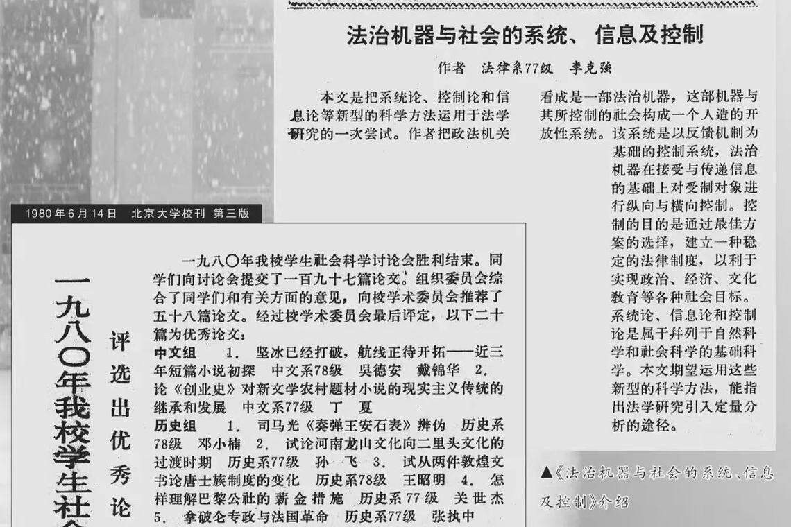 文章写道,李克强在北大本科学习期间奋发有为,成长为学生骨干,在北京大学校刊多有报道。其中第一次出现,是在1980年6月14日《一九八〇年我校学生社会科学讨论会结束——评选出优秀论文二十篇》一文中,他撰写的《法治机器与社会的系统、信息及控制》一文被评为优秀论文。