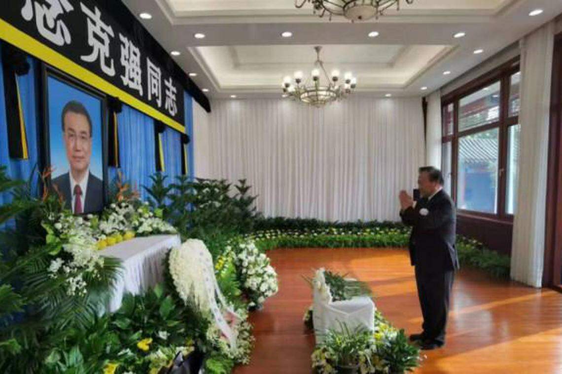 访者前往设在北京的李克强灵堂吊唁,灵堂正上方悬挂着黑底白字的横幅“沉痛悼念克强同志”。(互联网)