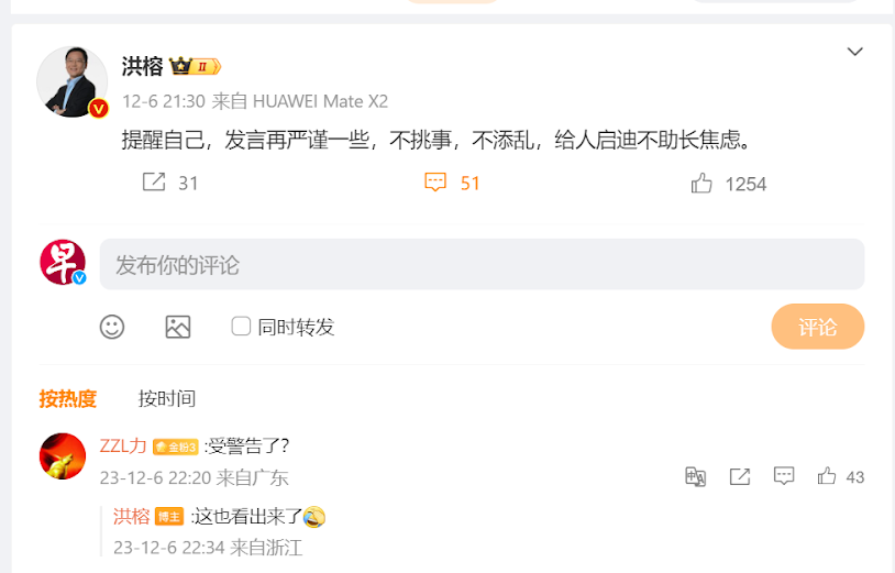 微博粉丝人数超过350万的洪榕,上星期三(6日)曾发文说:“提醒自己,发言再严谨一些,不挑事,不添乱,给人启迪不助长焦虑。”有网民就此在留言区问他是否“受警告了”????他直面回答:“这也看出来了。”