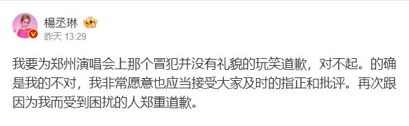 虽有不少网友留言抗议“绝对不接受她的道歉”、“去人家那里挣着人家的钱还说人家不好这是什么人呀”,但有网友还原杨丞琳开玩笑过程,称起因是一对情侣正在演唱会亲亲,让刚才亲亲的朋友挥舞荧光棒,这时台下观众都在挥舞荧光棒,因此杨丞琳才说“郑州人真的好调皮哦,河南人不可以这样子,你们已经有一些名声诶,你们知道吧,爱骗人的事情。”能感觉是在开玩笑,但却意外踩雷。