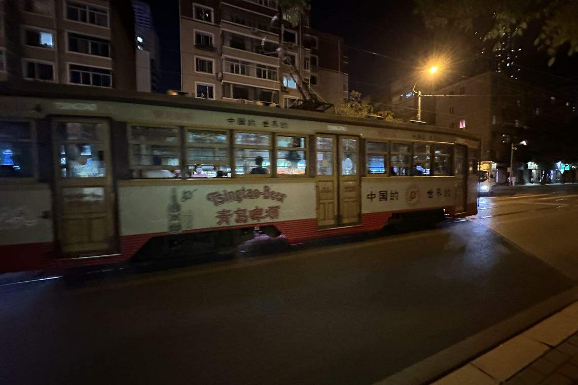 拥有上百年历史的大连电车在市中心的街道上缓缓驶过,古老的电车外形与这座现代都市形成鲜明对比,车轮与车轨碰撞发出“咣当咣当”的声响在宁静的夜里显得格外响亮。