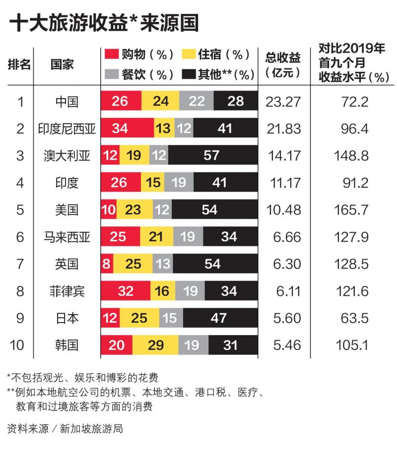 根据旅游局星期四(2月1日)公布的2023年旅游数据,除观光、娱乐和博彩业收益,中国旅客在去年的首九个月,为新加坡带来的旅游收益达到23亿2700万元,这个数目虽然只恢复至2019年水平的72.2%,但在所有市场中仍居第一位。