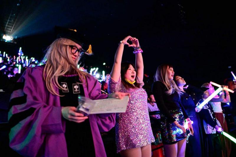 有粉丝已是第八次看这部电影,他们对每首歌烂熟于心,可以跟着音乐一字不落地高唱。图为2月3日一位中国歌迷在观看演唱会电影《泰勒丝:时代巡回演唱会》时比出爱心手势。(法新社)
