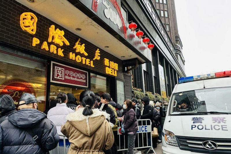 农历新年前夕,上海黄河路上人头攒动。在接近零度的寒风中,马路两侧的国际饭店西饼屋和杏花楼依然排起购买糕点的长队;路口的苔圣园酒家门前,更聚集不少拍照打卡的民众,警方不得不增派人手维持秩序。
