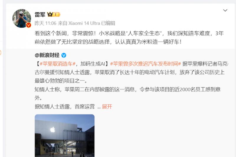 小米首席执行官暨联合创始人雷军星期三(2月28日)上午在微博转载苹果取消造车的报道,并写道:“看到这个新闻,非常震惊!小米战略是‘人车家全生态’,我们深知造车难度,三年前依然做了无比坚定的战略选择,认认真真为米粉造一辆好车!”