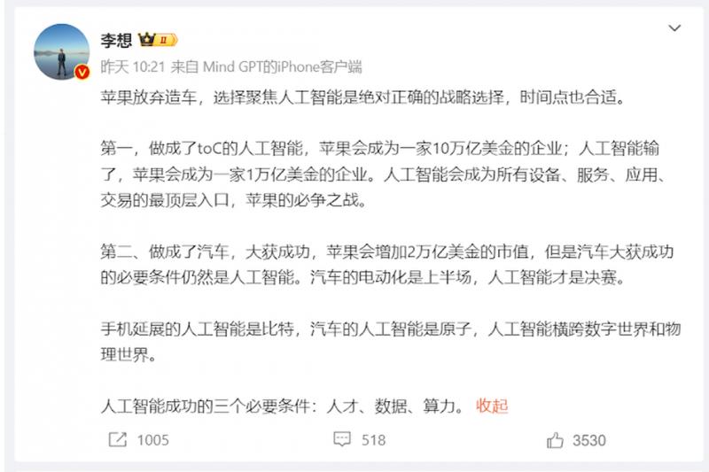 最近营收表现亮眼的中国电动车制造商理想汽车,其创始人兼首席执行官李想则在微博发文称:“苹果放弃造车,选择聚焦人工智能是绝对正确的战略选择,时间点也合适。”