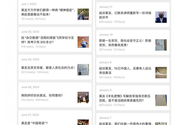 “战马行动”引发争议后,中国官媒曾集体下场批判他扰乱市场秩序,“爱国不是生意”。然而官媒的批判话音刚落,针对莫言的起诉便接踵而至。