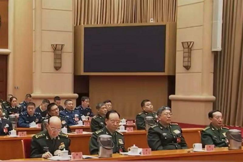 中国人民解放军战略支援部队司令员巨乾生(左二)也出席了解放军和武警部队代表团成立会。(视频截取)