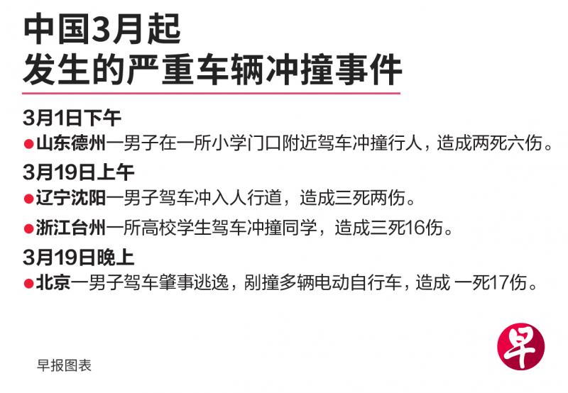 (北京/沈阳/台州/德州综合讯)中国辽宁省沈阳市、浙江省台州市,以及北京市在星期二(3月19日)接连发生严重车辆冲撞事件,共造成七人死亡,超过30人受伤。其中,北京的事故地点位在知名旅游景点附近。