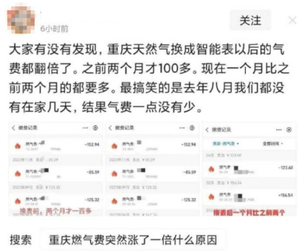 综合《中国经营报》《证券时报》等多家中国媒体报道,重庆网络问政平台显示,从今年2月开始,就有市民投诉,更换智能燃气表后,在同样使用频度的情况下,费用较以往增加了不少。投诉的市民来自重庆市的江津区、高新区、渝北区、巴南区、北碚区等多个区。