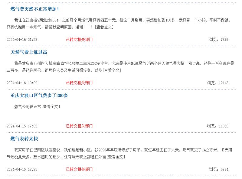 最近几天,中国重庆市和四川省成都市的一些居民群情激愤,很多人到政务平台上投诉燃气费用异常上涨。