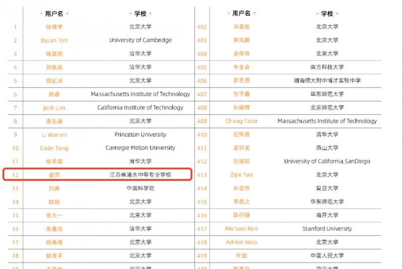 17岁的姜萍在801名选手中排名12。她也是这项赛事自2018年举办以来,首位入围的中专在读生。排在她前面的选手,分别来自北京大学、清华大学、英国剑桥大学,以及美国的麻省理工学院、加州理工学院、普林斯顿大学、卡耐基梅隆大学。排在姜萍后面的,还有中科院博士,奥数金牌选手等。