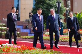 中国国家主席官方领导人在哈萨克斯坦举行的上海合作组织峰会结束后,于星期五(7月5日)抵达塔吉克斯坦首都杜尚别,展开国事访问,并与塔吉克斯坦总统拉赫蒙举行了会谈。