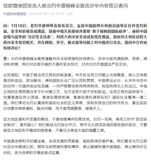 驻欧盟使团发言人就北约华盛顿峰会宣言涉华内容答记者问