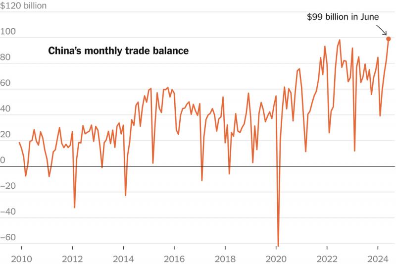 中国海关总署周五报告称,中国本已令人惊叹的出口在6月份又有大幅飙升。但随着中国企业和家庭在支出方面变得更加谨慎,进口出现萎缩。结果是当月贸易顺差超过990亿美元,创下新高。