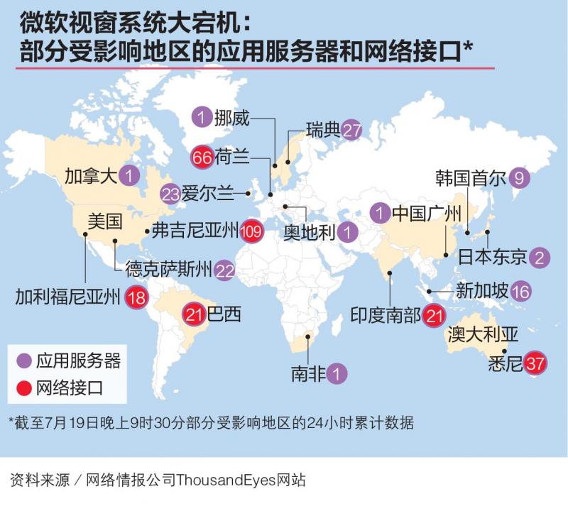 事件影响了世界各地多家公司企业的服务。例如,美国多家航空公司的电脑系统出现技术问题,向美国联邦航空管理局要求停飞;英国铁路运作受影响;澳大利亚一些银行顾客无法进行转账;各国媒体服务受影响等。