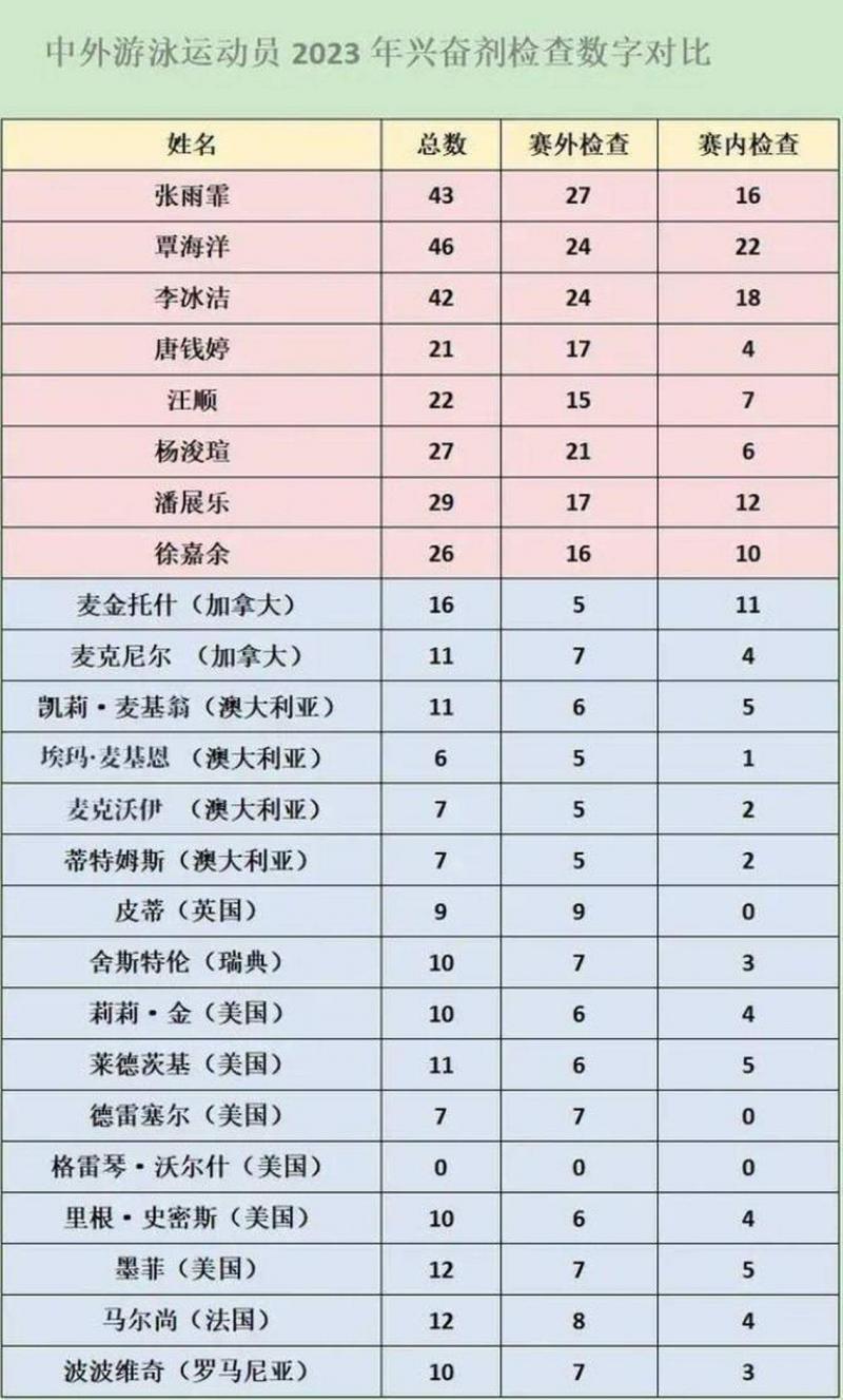 在此之前,中国游泳国家队营养师于良7月18日在微博发文吐槽,披露全队31名运动员在到达巴黎后的10天内,总共接受国际兴奋剂检测组织的检查200次,平均每天接近20次,每人平均五至七次,严重影响运动员的休息和训练。