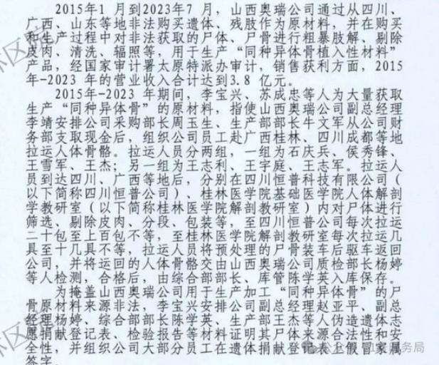 2015年至2023年间,奥瑞生物与四川恒普科技公司被指勾结各地医院和殡仪馆,非法盗窃了4000多具遗体。这些遗体被“粗暴肢解、剔除皮肉、清洗、辐照等,用于生产‘同种异体骨植入性材料’”。
