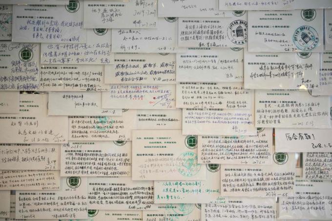 华盛顿的季风书园内,展示着上海季风书园关门前,读者写给书店的告别卡片。(法新社)