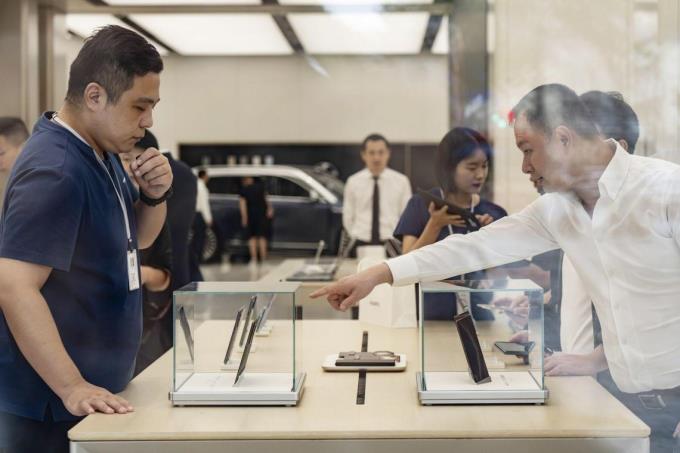 华为首款三折叠屏手机Mate XT非凡大师一经上市瞬间秒空。图为华为位于上海一家门店内。(彭博社)