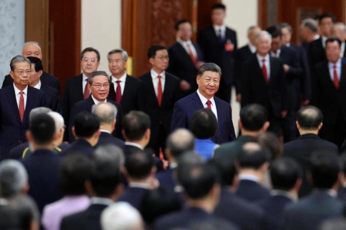 庆祝中华人民共和国75周年国庆招待会星期一(9月30日)在京举行,中共领导人和政治局前常委步入会场。在此照片中,远处依稀可见前常委曾庆红、温家宝、李瑞环。(路透社)