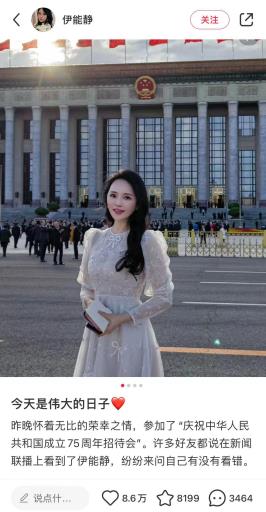 被网民拿来与吴慷仁对比的伊能静,9月30日晚受邀到北京人民大会堂出席75周年国庆招待会,还出现在央视《新闻联播》镜头中。