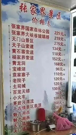 这张在网上曝光的照片显示的是“张家界景区价格表”,里头列了19个大大小小景点的门票价格,收费从每张76元(人民币,下同,14新元)到每张308元不等,价格几乎都在三位数以上,200元以上的景点也不在少数。若想游览全部景点,总花费高达3500元左右。