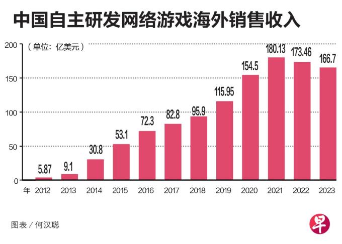 中国音数协游戏工委发布的《2023年中国游戏产业报告》显示,中国游戏企业去年在海外市场的总收入达163亿6600万美元,规模连续四年超千亿人民币(1000亿元人民币约为185亿新元),相较于2014年的30亿7600万美元,10年间增长了超过四倍。