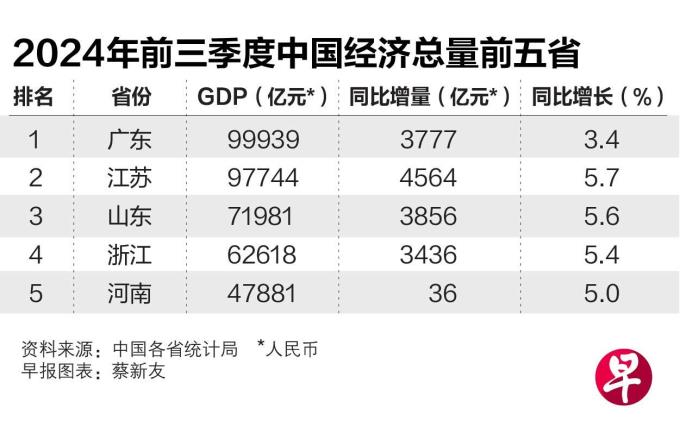 广东省统计局10月底公布的数据显示,今年前三季度,广东地区生产总值(GDP)接近10万亿元(人民币,下同,1.86万亿新元),同比增长3.4%。这低于第一季的4.4%和上半年的3.9%,显示广东经济增长步伐今年来持续放慢。