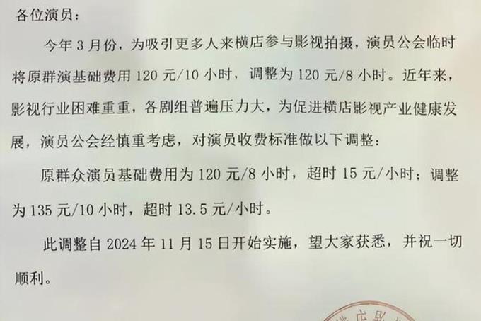 一份由横店影视城演员公会在11月13日盖章的通知,近期在中国网络上流传。通知称,近年来影视行业困难重重,各剧组普遍压力大,为促进横店影视业产业健康发展,演员公会经慎重考虑,对演员收费标准作出调整。