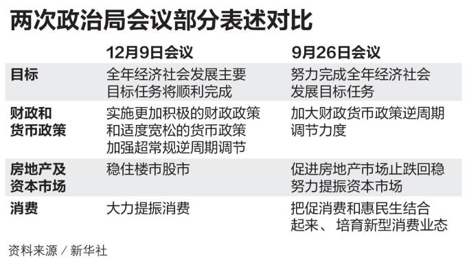 财政货币政策方面,会议在当前“积极的财政政策”基础上,提出将实施“更加积极的财政政策”。