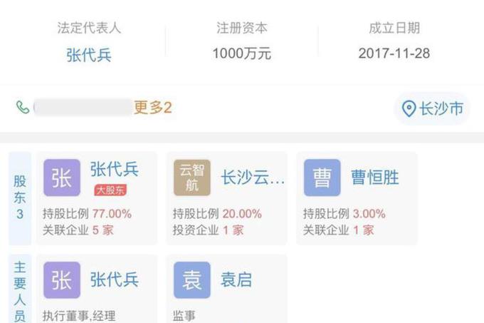 根据企查查显示,张代兵创办的长沙市云智航科技有限公司成立于2017年11月,注册资本1000万元人民币(185.6万新元),法定代表人张代兵,持股比例为77%。