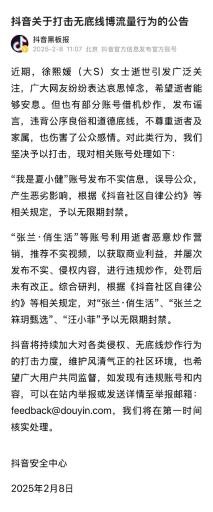 抖音也说,“张兰·俏生活”等账号利用逝者恶意炒作营销,推荐不实视频,以获取商业利益,并屡次发布不实、侵权内容,进行违规炒作,处罚后未有改正。综合研判,根据《抖音社区自律公约》等相关规定,对“张兰·俏生活”、“张兰之箖玥甄选”、“汪小菲”予以无限期封禁。