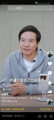 之后,雷军10月29日在抖音平台发布视频,表示AI是非常好的技术,也非常实用,但坦言雷军AI语音包的确让他深受困扰,呼吁网民不要再恶搞,“挺不舒服的,希望大家都不要玩了,这个事情不太好”。