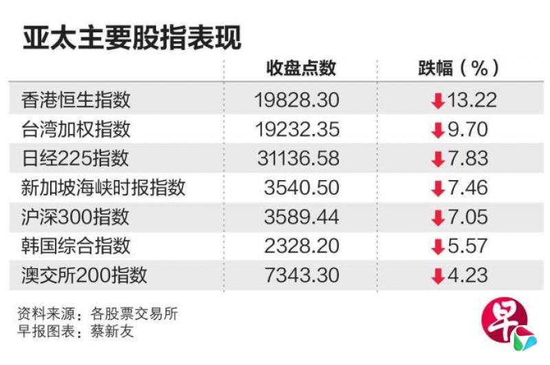 日本触发熔断机制,韩国一度暂停交易。香港恒生指数暴跌13.22%,为近30年来最大单日跌幅,领跌亚太市场。台湾加权指数重挫9.70%,台积电跌停。中国A股逾半数个股跌停,上证指数下跌7.34%,深证指数跌幅达9.66%。其他市场方面,日经225指数跌7.83%,韩国综合指数跌5.57%,澳洲ASX 200指数下跌4.23%。