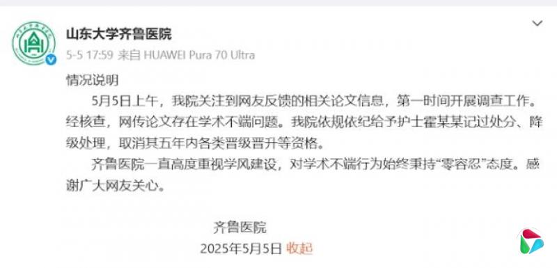 面对排山倒海的舆论压力,山东大学齐鲁医院在星期一(5月5日)下午作出回应。该医院在官方微博发布情况说明称,该医院当天上午关注到网民反馈的相关论文信息,第一时间开展调查工作。经核查,网传论文存在学术不端问题。“院方依规依纪给予护士霍某某记过处分、降级处理,取消其五年内各类晋级晋升等资格。”